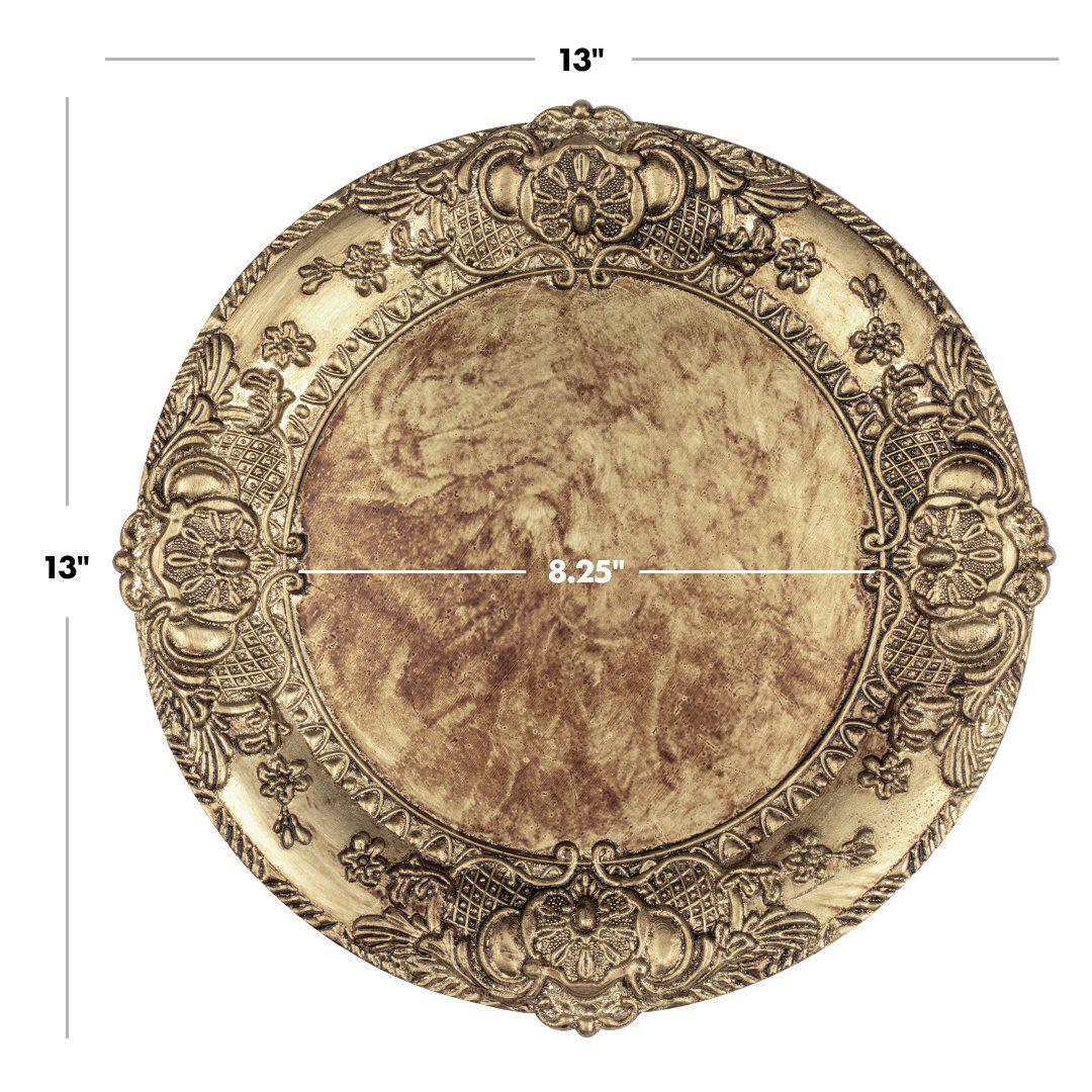 - MATERIAL: Made from acrylic, these high quality charger plates are a durable acrylic set of 12. As a durable acrylic set, it goes well with salad plates, soup bowls and main course dinner plates. With its baroque antique embossed edge design style, adding porcelain ceramic plates compliments a classic elegant tablescape to a more rustic regal wedding decor. Easy care for these charger plates with simple handwash, not dishwasher friendly.