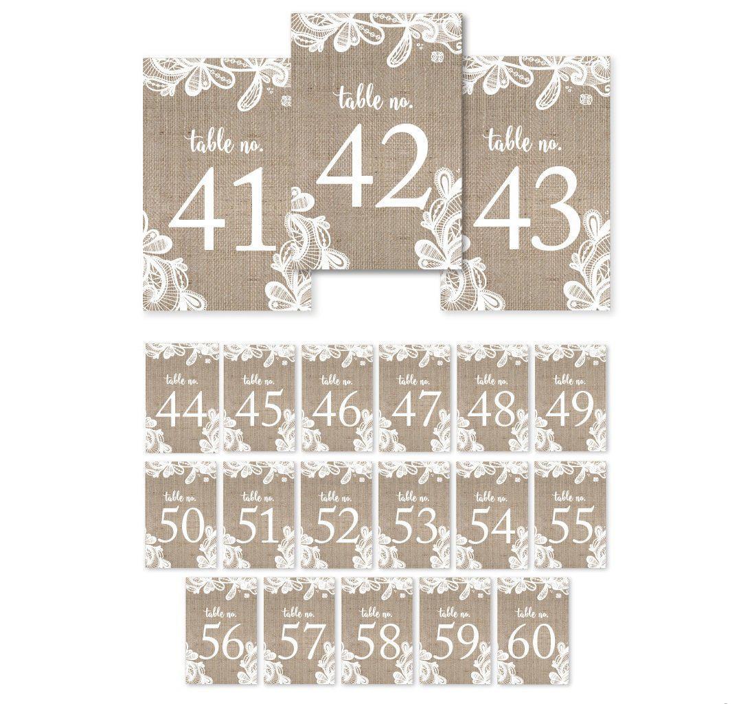 Direct your party guests to their appropriate table with our stylish and unique burlap and lace table number designs. Forget boring black numbers on white paper, and liven up your wedding or special event with our professionally printed rustic burlap and lace table numbers on heavy cardstock. With bold and vibrant colors and details, our classic burlap and lace table numbers will encourage your guests to find their seats quickly and efficiently. For the DIY party planner or bride, frame these chic burlap and lace table numbers in your choice of frame for an added embellishment. Made in the USA.