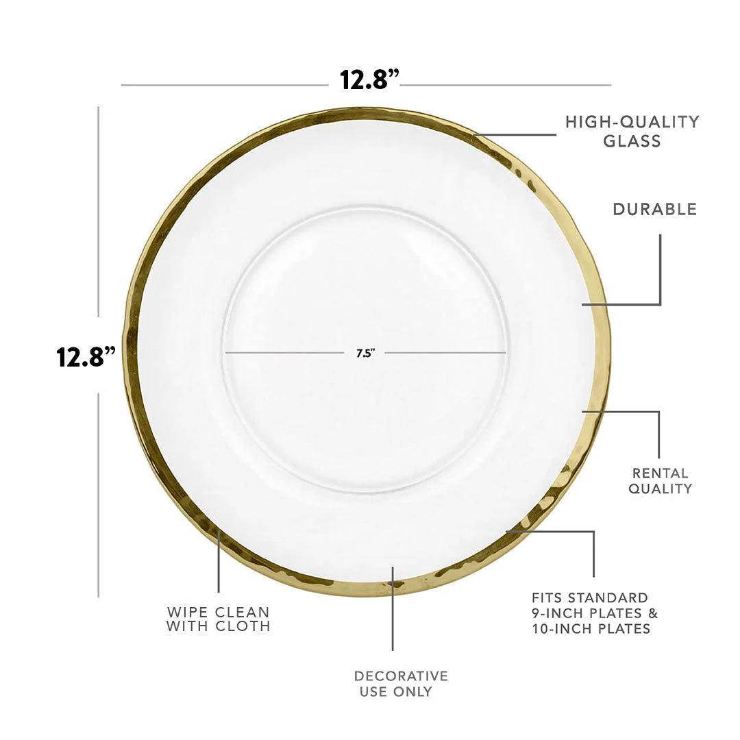 Instantly enhance each table setting with our modern Glass Charger Plates with Gold Rim or Silver Rim, also known as glass charger with gold or silver trim, or glass gold or silver rim hammered charger. Each plate is made of glass and crafted to be sturdy and strong ideal for multi-use. Our glass charger plates are durable and made for repeat use, great for rental, hire and all occasions. When hosting a dinner party the Koyal Wholesale'selection of glass charger plates provides a variety of choice from; glass charger with gold beading, clear glass charger plates, glass charger with gold rim, glass charger plates red, glass charger gold, glass gold rim hammered charger and more! The vibrant gold metallic color rim on each glass charger plate magnifies the hammered texture design. The classic design is perfect for tea party inspired themes, girls luncheons, shabby chic tabletop ideas and more. Our charger plates are the excellent display plate to elevate the look of your table top for any occasion from weddings and special events to everyday parties. Each glass charger plate set is packaged securely for safe arrival.