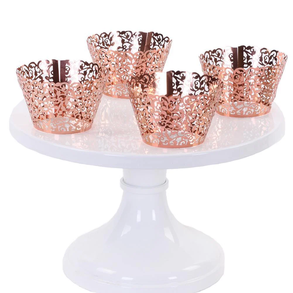 - Elegant Vintage Filigree Design. Features an ornate laser cut rose gold floral vine design with scallop edge. The mirror metallic inspired look pairs well with many cupcake themes from Boho, modern geometric, industrial chic, and glam dessert decor. Decorate cupcakes with rose gold dust, toppers, sprinkles, pearls, or sprays and display them in these elegant rose gold cupcake wrappers.