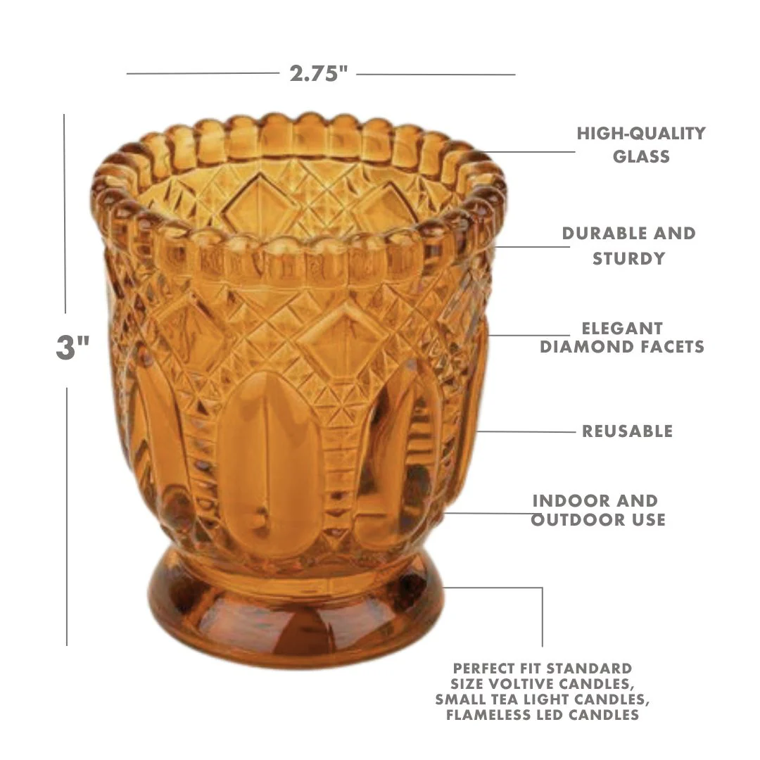 Featuring antique-style diamond facets, beaded rims, and flared pedestal bases, these candle holders a classic go-to for wedding decorations, stylish birthday celebrations, baby showers, tea parties, and more! The unique jewel-tone antique style makes it easy to create a classy vintage, boho beach, and colorful themes for memorable events.