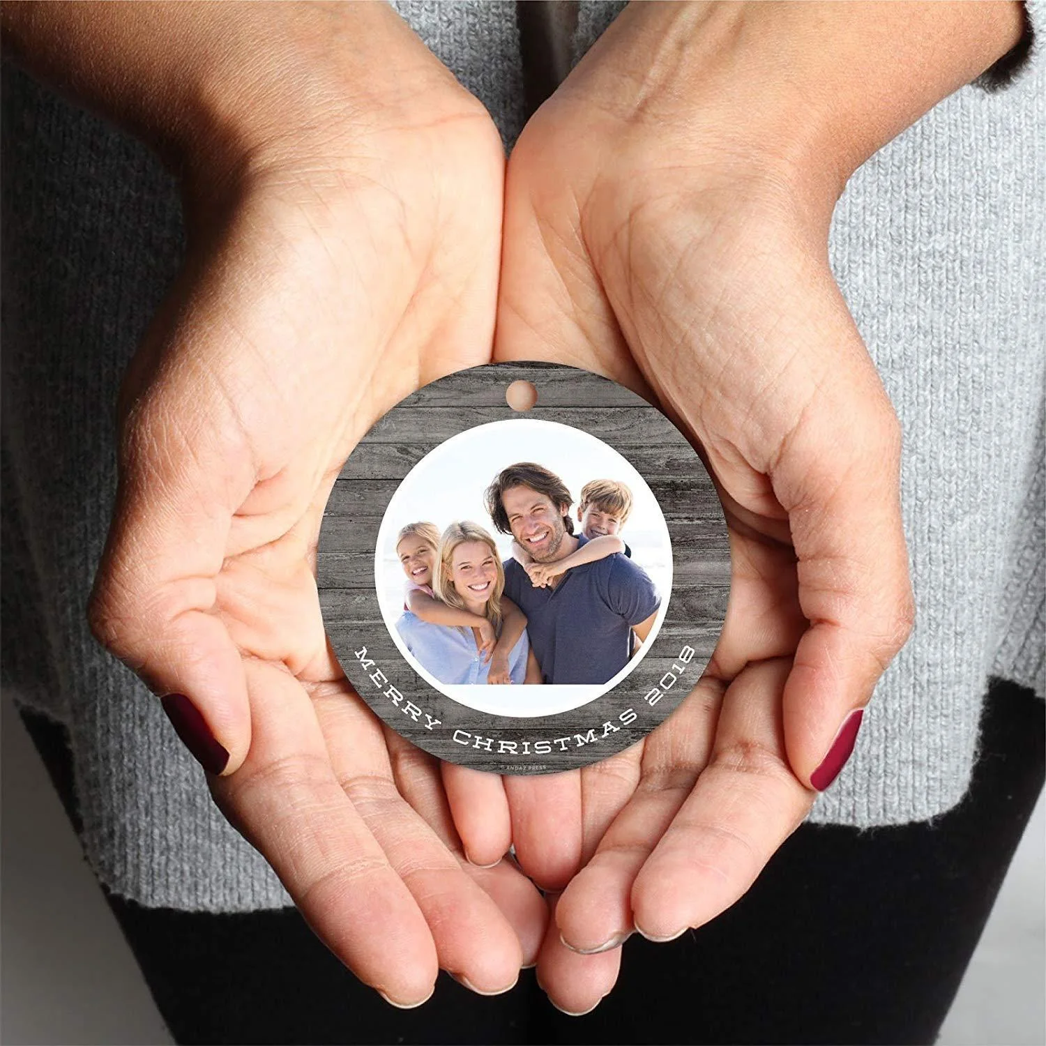 Personalized Metal Christmas Ornament, Gray Rustic Wood, Merry Christmas, Custom Year & Photo