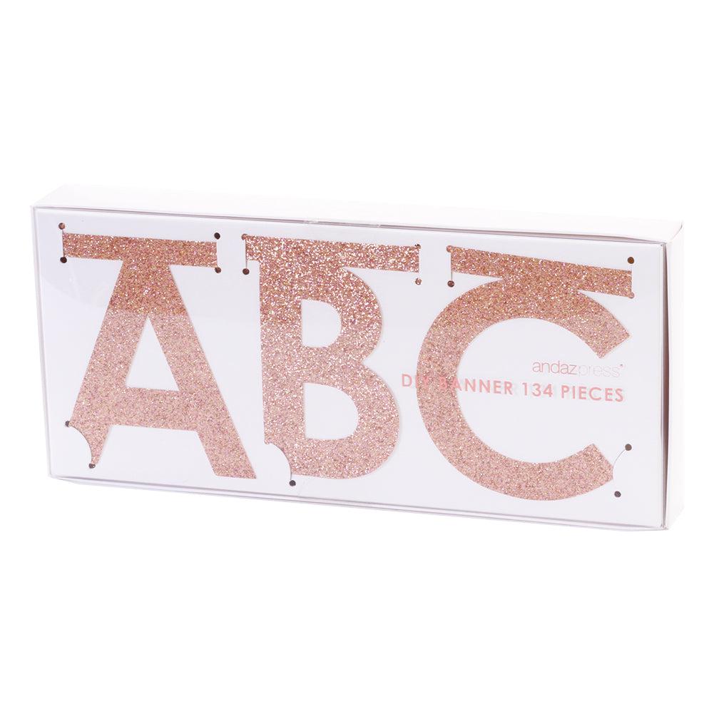 Where can you buy a DIY banner kit with letters, numbers and special characters in rose gold glitter? Andaz Press. Our rose gold DIY party banner kit is made of premium thick 300 gsm quality cardstock paper. These elegant real glitter paper banner letters measure 3.5-inch x 3.5 inches and are reinforced with card-stock. Ideal for hanging with hanging banner clips, banner grommets, or banner adhesive hangers. Pair with decorative tassel garlands, latex balloons, foil balloons, foil curtains and more. Our sturdy quality paper DIY banner kit with letters is easy to use, simply string the thick twine string through pre-whole punched banner. This rose gold thick banner is made with premium quality 300 gsm thick cardstock and is a reliable party supply decoration for every special occasion. These banner letters feature real glitter that shines in the light beautifully. This is the ideal DIY banner kit with letters to create custom banner garlands for just married, tradeshows, now hiring banner, happy birthday banner, highchair banner, 50th anniversary, Miss to Mrs., baby nursery, mantle banner, ?I am one? banner, wedding shower, ?yay? banner, bachelorette banner and more.