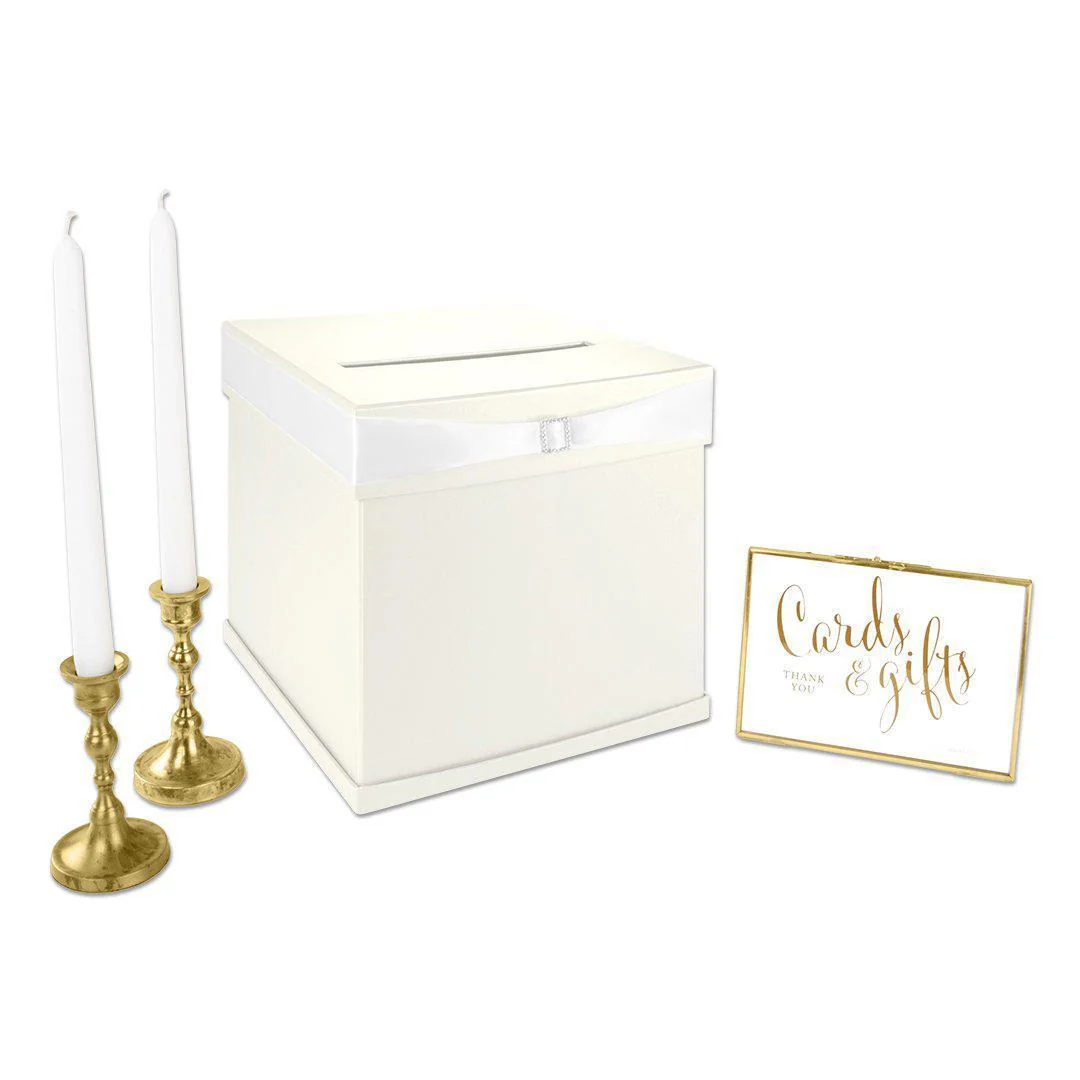 Instantly add elegance and glamour to your wedding gift table with our classic wedding reception card box. Our simple card holder is carefully crafted with heavy duty card stock and glammed up with both a beautiful satin ribbon and rhinestone buckle. Our gift card box is perfect for weddings, anniversaries, birthdays, graduations, bridal or baby showers. The clean cut design securely holds congratulatory cards, gift envelopes, cash gifts, money envelopes and gift cards. Our wedding card box is the ideal alternative to the standard wedding card cage, wooden card box, wedding card mail boxes, acrylic wedding card treasure box or glass card box. Our card box is easy to assemble and more than just a wedding card box. Use our card box as a keepsake to store your memories or reuse for other special occasions. The card holder is suitable for many decorating styles from classic, hollywood glam, traditional, romantic, vintage, whimsical, garden, modern, minimalist, mid-century modern, contemporary.