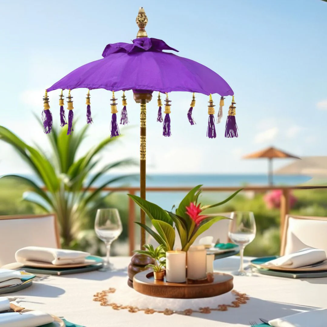 These tabletop Bali Umbrella centerpieces are inspired by the ceremonial parasols that decorate Balinese temples on special occasions. Your elaborate Bali umbrella tabletop decorations will add the right amount of enchanting detail to your tablescapes and displays. You don’t need to assemble any parts on these umbrellas — they are incredibly easy to unfold. Simply open each of the umbrella table centerpieces and insert the wooden pin to secure the umbrella open and instantly create the focal point of your table displays. Your tabletop Bali umbrella centerpiece is already a showstopper, but consider adding a plethora of bright-colored decorations to complete your tabletop displays. Bamboo rattan lamps, decorations, and chargers pair almost too perfectly with these beautiful tasseled umbrellas. If you want to add a graceful finishing touch to your event, scatter small colorful votive candles around your tabletop displays. There’s something intrinsically breathtaking about the flickering candlelight underneath a tasseled Bali umbrella.